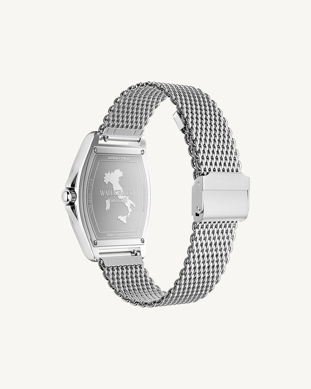 Strap: Mesh strap in rhodium-plated 316L stainless steel